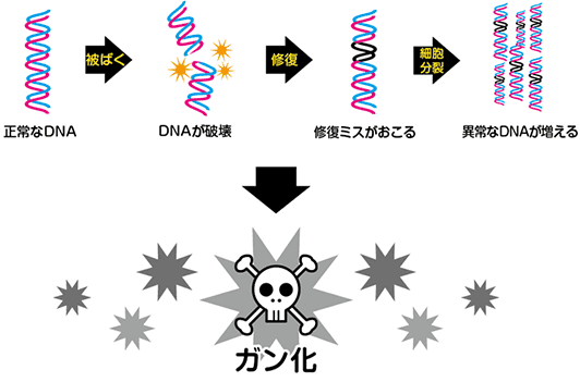 人体が放射線にさらされることを「被ばく」といいます。人の体は細胞でできていて、細胞の中には水分や酵素等のタンパク質、遺伝子を構成するDNAなどが入っています。被ばくすると、放射線が細胞の中のDNAを傷つけます。被ばく量が少なければ、DNAの傷は自動的に修復され、細胞は正常な状態に戻りますが、被ばく量が多い場合、DNAが完全に壊れ、細胞は正常な修復ができなくなります。この壊れたDNAこそが、細胞をガン化させるのです。