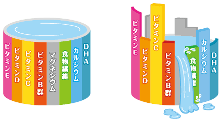私たちの体も、同じく桶に例えることができます。風邪予防にビタミンCが効くからと言って、ビタミンCばかりをたくさん摂っても、他の栄養素が足りなければ、ビタミンCは本来の力を発揮できず、風邪を予防することができません。大人向けサプリメント等で「ベースサプリメント」として、マルチビタミンを摂ることを推奨しているのはこの考え方によるものです。
